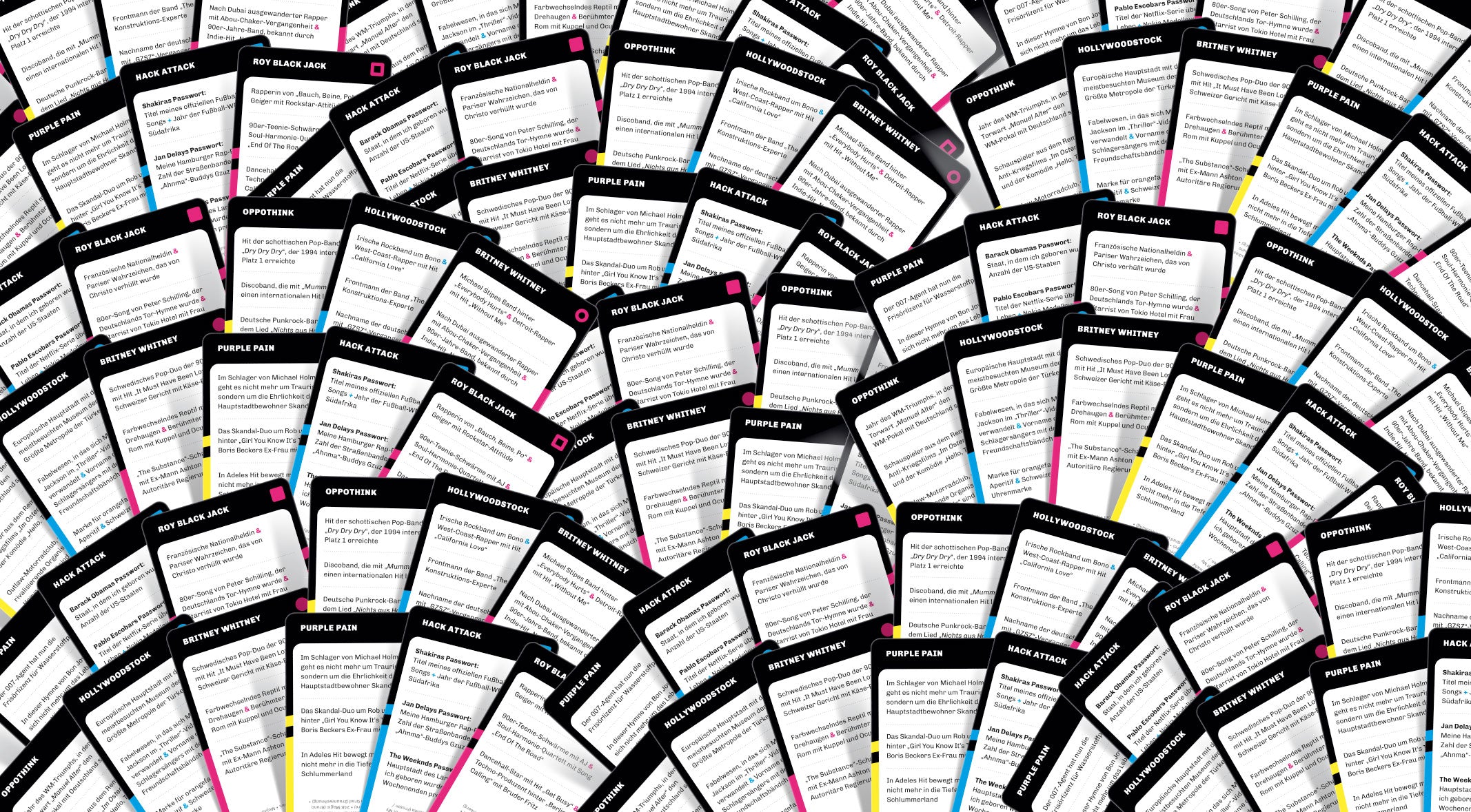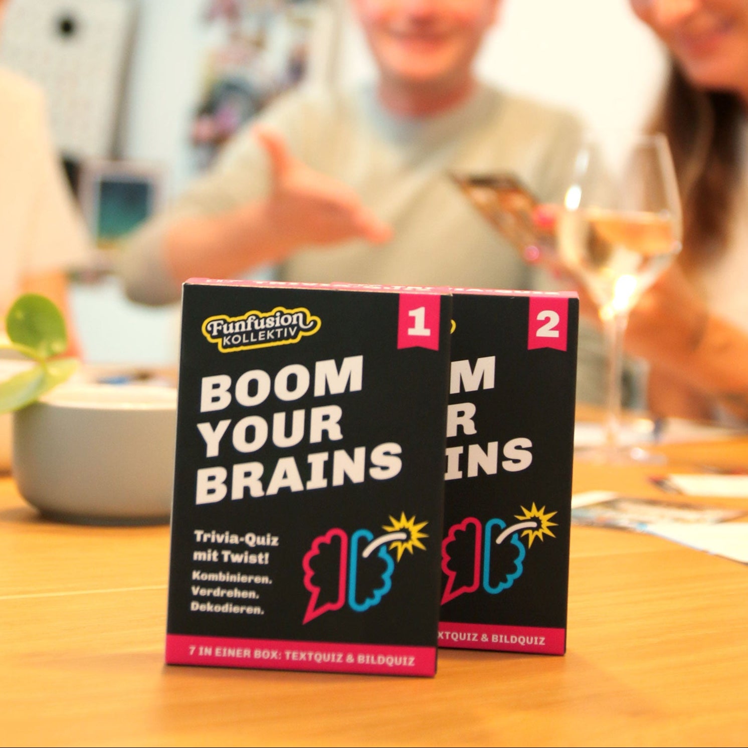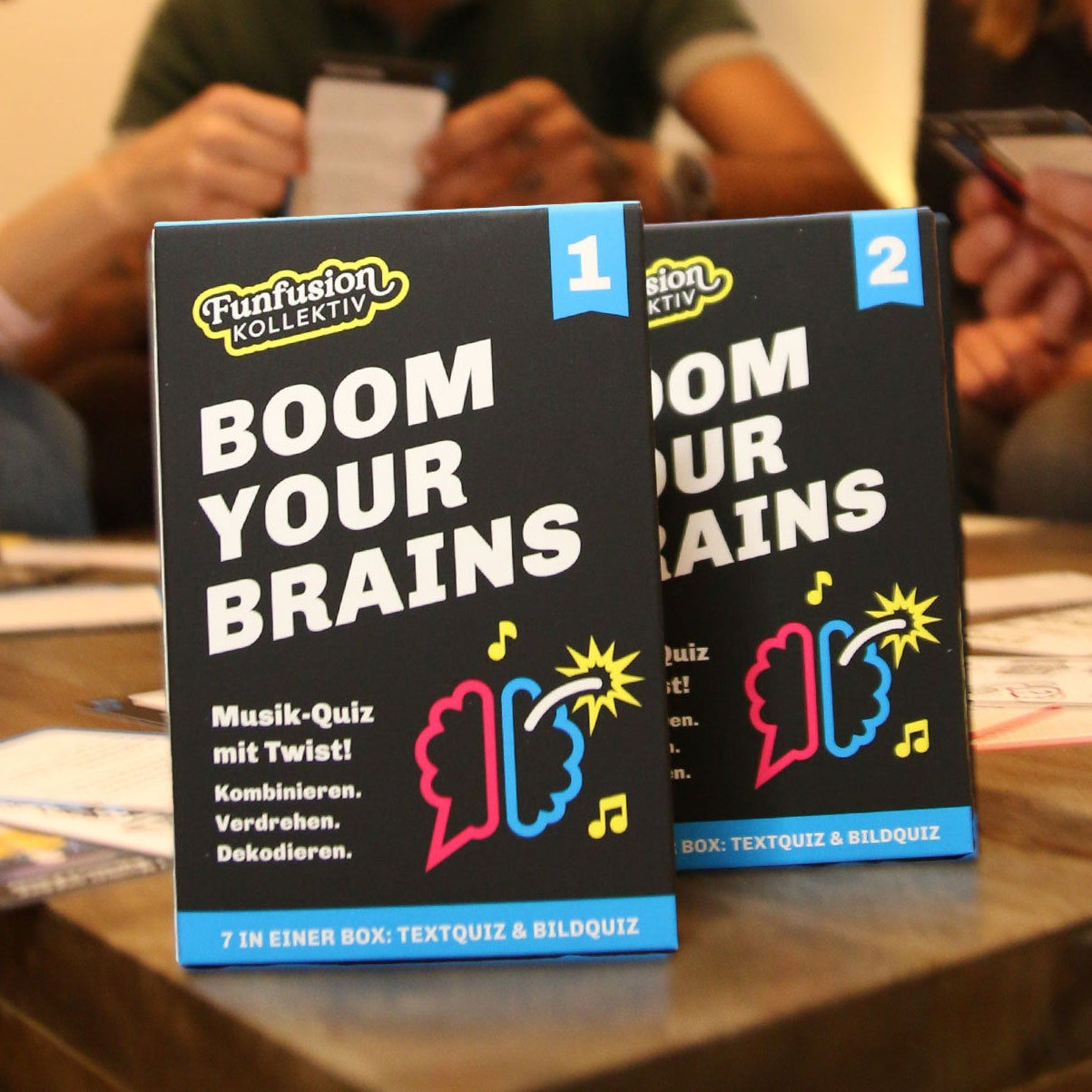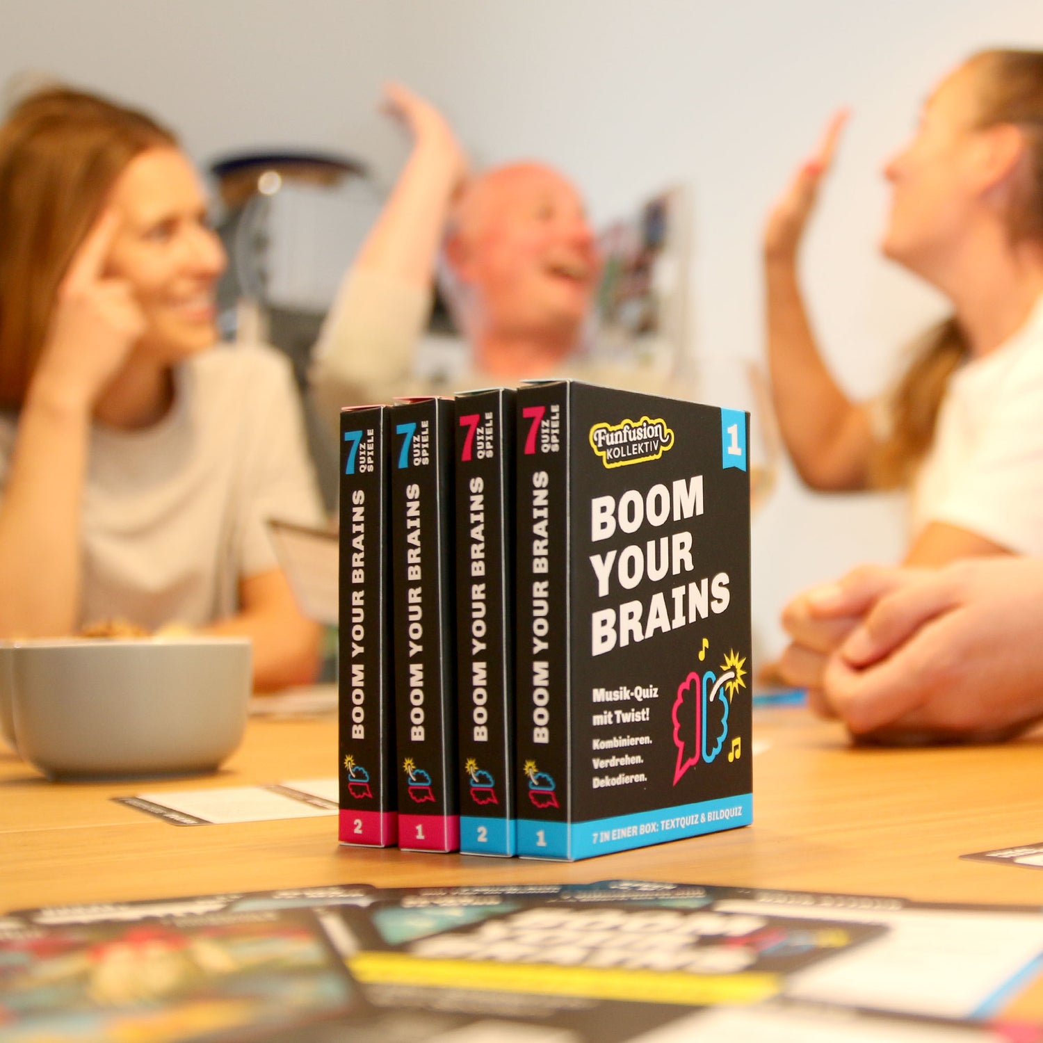 Die Boom Your Brains Family besteht aus vier unabhängigen Editionen, die jede Quiz-Herausforderung meistern. Jede Box enthält sieben von unseren insgesamt zehn kreativen Quiz-Formaten. Wähle zwischen den Trivia-Boxen für Popkultur, Geschichte und Wissenschaft oder den Musik-Boxen für den ultimativen Soundcheck.
