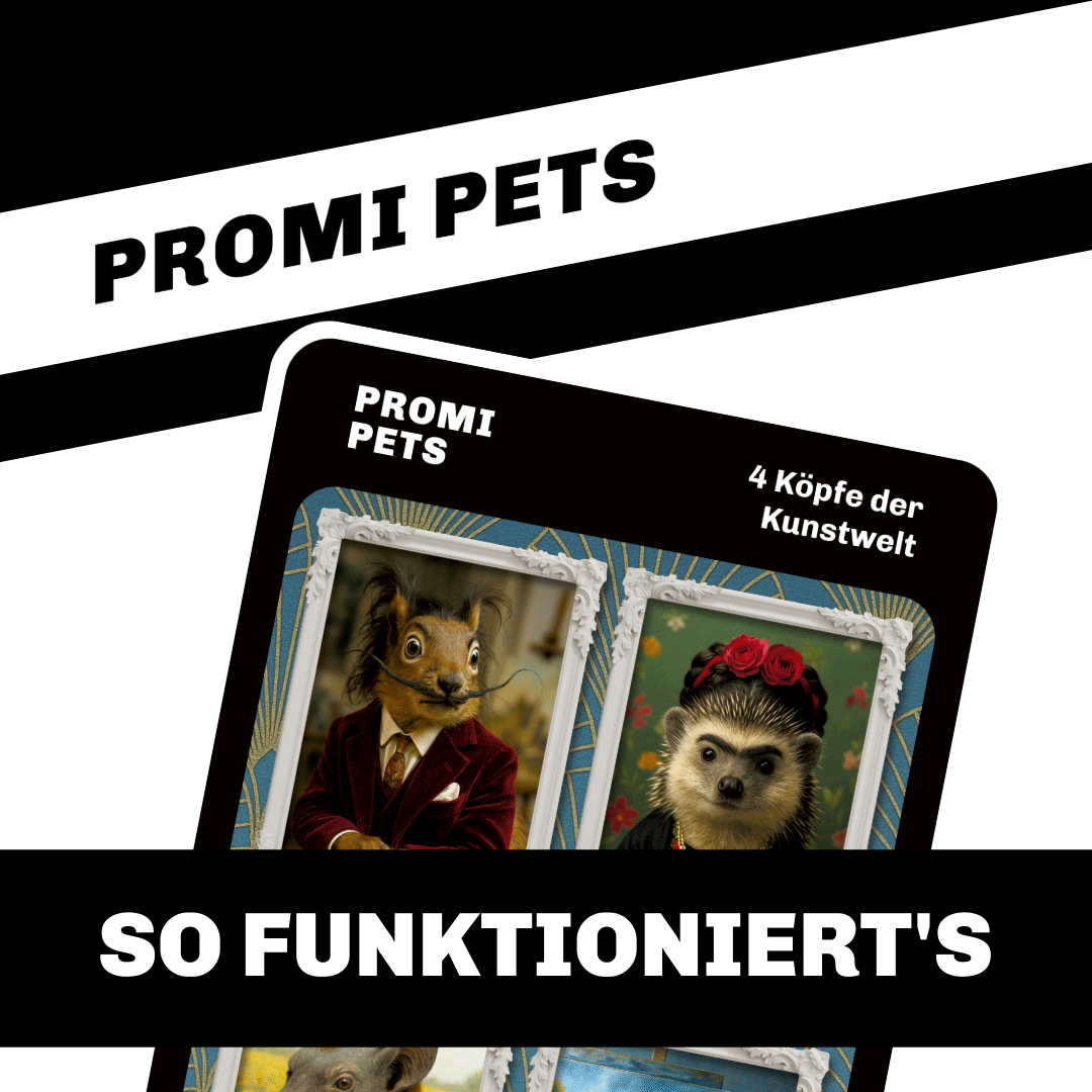 PROMI PETSAuf jeder Karte sind vier Porträts von Tieren abgebildet, die mit auffälligen Accessoires oder typischem Styling bekannte Personen und Figuren darstellen. Zu erraten ist: Wer wird hier tierisch dargestellt?