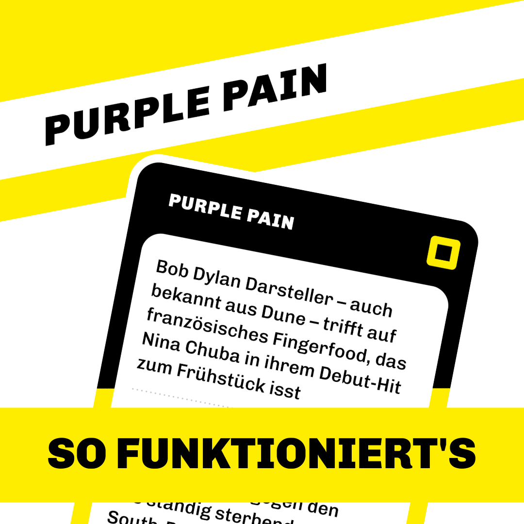 PURPLE PAINWas sich reimt, wird kombiniert. Die Lösung besteht aus mindestens zwei Wörtern. Ein Wort darin wurde ausgetauscht – gegen ein anderes, das sich darauf reimt. Es können sich auch deutsche auf englische Wörter reimen. Als Reim zählt der Klang – nicht die Schreibweise. Am Ende entsteht ein neuer, erfundener Begriff.