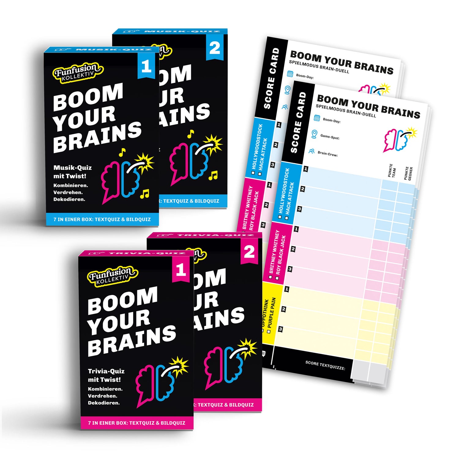 Das gesamte Boom-Universum in einem Paket! Mit diesem Mega-Bundle sicherst du dir alle vier Editionen (Trivia 1 & 2, Musik 1 & 2) und zwei Scorecard-Sets für den maximalen Quiz-Spaß. Du erhältst das komplette Repertoire an 10 kreativen Quiz-Formaten und über 2020 Begriffen. Perfekt für Marathon-Abende, große Gruppen oder als ultimatives Geschenk für den größten Quiz-Fan!